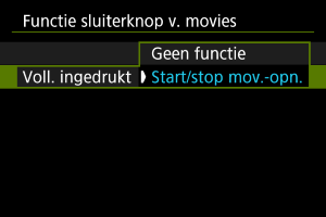 Wanneer [Voll. ingedrukt] is ingesteld op [Start/stop mov.-opn.], kunt u de video-opname niet alleen starten en stoppen met de video-opnameknop, maar ook door de ontspanknop volledig in te drukken, of door gebruik van een draadloze afstandsbediening (afzonderlijk verkrijgbaar).