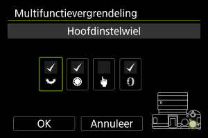 Geef aan welke camerabediening vergrendeld moet worden als de multifunctievergrendeling is ingeschakeld. Dit kan helpen bij het per ongeluk wijzigen van instellingen.