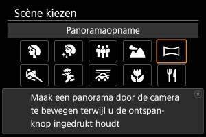 Gebruik [] (Panoramaopname) om panorama's op te nemen. Het panorama wordt gegenereerd door opnamen te combineren van continue opnamen terwijl u de camera in één richting beweegt en de ontspanknop volledig ingedrukt houdt.