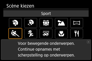 ] (Hoge snelheid). Druk op het juiste moment de ontspanknop volledig in om de opname te maken. Om het onderwerp te volgen en de verschillende bewegingen van het onderwerp vast te leggen blijft u de ontspanknop ingedrukt houden om continue opnamen te maken.