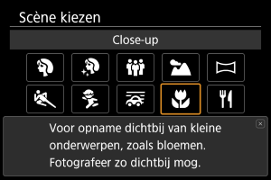 Gebruik [] (Close-up) voor close-ups of voor kleine onderwerpen zoals bloemen. Gebruik een macrolens (afzonderlijk verkrijgbaar) om kleine onderwerpen veel groter te laten uitkomen.