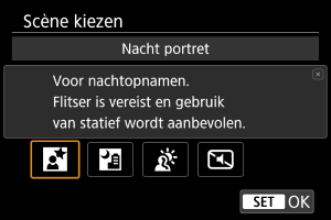 Gebruik [] (Nacht portret) voor heldere, mooie opnamen van mensen met nachtopnamen op de achtergrond. Houd er rekening mee dat voor opnamen in deze modus een externe flitseenheid nodig is. U wordt aangeraden een statief te gebruiken.