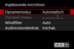 Selecteer [Aan] voor geluidsopname tijdens video-opnamen. De ingebouwde microfoon wordt gebruikt voor opname, tenzij u microfoons gebruikt die extern zijn of die bedoeld zijn voor de multifunctieschoen.