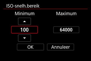 U kunt het bereik van de handmatige ISO-snelheid instelling instellen (de minimum- en maximumgrenzen).
