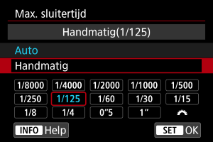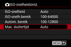 U kunt de langste sluitertijd voor ISO auto instellen om te voorkomen dat automatisch ingestelde sluitertijden te lang worden.