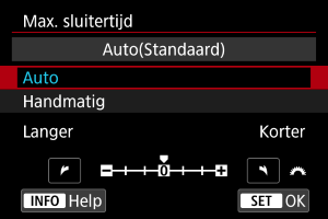 - Wanneer [Auto (Standaard)] is ingesteld, is de langste sluitertijd het omgekeerde van de brandpuntsafstand van de lens. Een enkele stap van [Langer] naar [Korter] is gelijk aan een enkele stop van de sluitertijd.