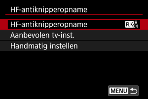 Controleer het scherm op beeldgebieden die worden aangetast door lichtbronnen die op hoge frequenties flikkeren en zoek een geschikte sluitertijd.