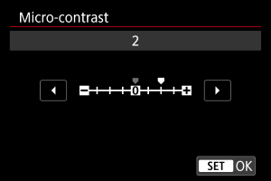 - Instelling van het micro-contrast kan de gebieden rond de grenzen van beelden met een hoog contrast donkerder of lichter maken.