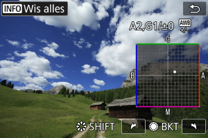- B staat voor blauw, A voor amber, M voor magenta en G voor groen. De witbalans wordt gecorrigeerd in de richting waarin u de markering verplaatst.