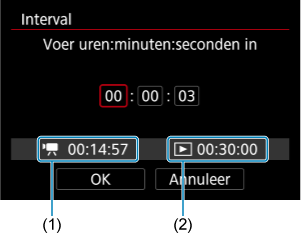 Geeft de vereiste tijd aan voor het maken van het ingestelde aantal opnamen met het ingestelde interval. Indien dit meer is dan 24 uur, wordt “*** dagen” weergegeven.