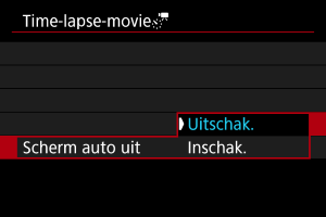 - De volgende handelingen annuleren stand-by voor time-lapse-video-opnamen en wisselen de instelling naar [Uitschak.].