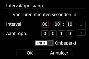 Instelbaar binnen het bereik [0001]–[9999]. Als u de intervaltimer voor onbepaalde tijd wilt behouden totdat u deze annuleert, selecteert u [Onbeperkt].