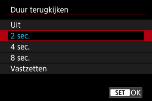 Om het beeld onmiddellijk na opname op het scherm te laten blijven stelt u in op [Vastzetten] en als u het beeld niet wilt weergeven, stelt u in op [Uit].