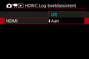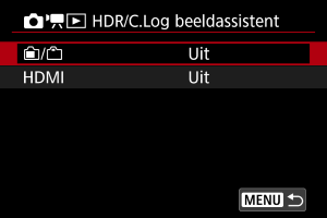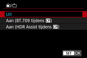 HDR-opname (PQ)] of bij opnamen met aangepaste beelden (), zoals weergegeven op het camerascherm, de zoeker of niet-HDR-weergaveapparaten die zijn aangesloten via HDMI, kan worden aangepast zodat ze lijken op het uiterlijk van HDR-weergaveapparaten.