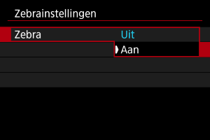 - [Zebra 2]: geeft rechtshellende strepen weer boven gebieden die de opgegeven helderheid overschrijden.