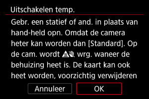 U kunt de maximale temperatuur voor de camerabehuizing instellen waarbij de camera automatisch wordt uitgeschakeld. Als u dit niveau hoger instelt dan de standaardtemperatuur, kan dit de beschikbare opnametijd verlengen doordat bepaalde bedrijfsbeperkingen worden opgeheven.