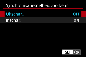 - In sommige opnameomstandigheden kan onderbelichting optreden wanneer [Synchronisatiesnelheidvoorkeur] is ingesteld op [Inschak.].