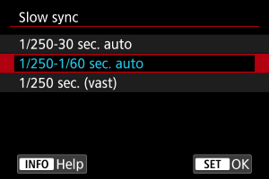 Stel deze optie in op [Hogesnelheidssynchronisatie] voor flitsfotografie bij kortere sluitertijden dan de flitssynchronisatietijd. Dit is effectief bij het maken van opnamen met een open diafragma in de modus Av om bijvoorbeeld bij daglicht de achtergrond achter onderwerpen buitenshuis te vervagen.