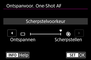 U kunt opgeven of de voorkeur moet worden gegeven aan scherpstellen of aan de sluitertijd voor 1-beeld AF (behalve bij opnemen met de Touch Shutter).
