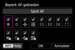 U kunt de beschikbare AF-gebieden beperken tot de gebieden die u normaal gebruikt. Selecteer beschikbare AF-gebieden en druk op om een vinkje [