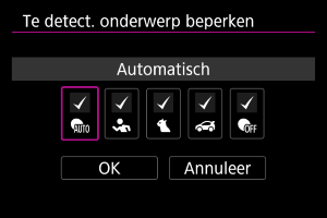 U kunt de beschikbare instellingsopties in [: Te detect. onderw.] beperken tot de opties van uw voorkeur. Selecteer een optie die u wilt uitsluiten en druk op