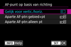 U kunt afzonderlijke soorten AF-gebieden of posities van AF-punten instellen voor verticale en horizontale opnamen.