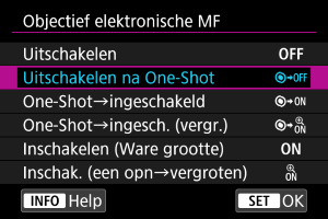 Voor bevestigde lenzen die elektronische handmatige scherpstelling ondersteunen, kunt u de werking van handmatige scherpstelling opgeven.
