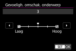U kunt instellen hoe gemakkelijk de scherpstelling wisselt bij detectie van een nieuw onderwerp tijdens video-opnamen. Hoe hoger de waarde, hoe gemakkelijker er van onderwerp wordt gewisseld.