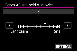 U kunt de AF-snelheid voor Servo AF voor video's instellen. Deze functie is ingeschakeld met [Servo AF v. mov.] in [: Servo AF voor movie] ingesteld op [Inschak.] wanneer u lenzen gebruikt die compatibel zijn met een langzame overgang van scherpstelling tijdens video-opnamen.*