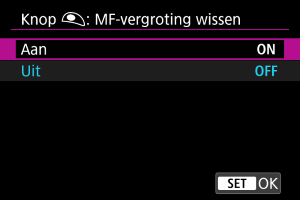 Als u deze functie instelt op [Aan], kunt u de vergrote weergave annuleren door de ontspanknop half in te drukken wanneer u foto's maakt in de MF-scherpstelmodus.