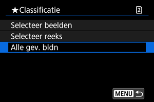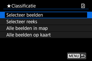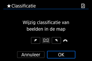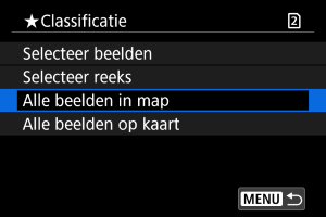 : Classificatie] de optie [Alle beelden in map] of [Alle beelden op kaart] selecteert, worden alle beelden in de map of op de kaart beoordeeld.