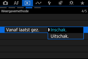 ]: Wanneer de camera opnieuw wordt opgestart, wordt afspelen hervat vanaf de meest recente opname.