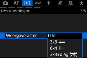 U kunt een raster over foto's weergeven bij weergave van één opname op het afspeelscherm. Deze functie is handig om de verticale en horizontale kanteling en de compositie van het beeld te controleren.