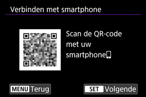 - Als Camera Connect niet is geïnstalleerd, gebruikt u de smartphone om de QR-code op het scherm te scannen, gaat u naar Google Play of App Store om Camera Connect te installeren, en drukt u op