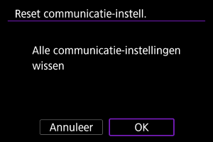 Alle draadloze communicatie-instellingen kunnen worden gewist. Door de draadloze communicatie-instellingen te wissen kunt u voorkomen dat de informatie wordt weergegeven wanneer u de camera uitleent of weggeeft.