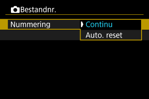 Houd er rekening mee dat de bestandsnummering van bestaande beelden op kaarten of in mappen waarnaar u overschakelt, kan worden voortgezet. Als u een doorlopende bestandsnummering wilt gebruiken, raden we u aan elke keer een opnieuw geformatteerde kaart te gebruiken.