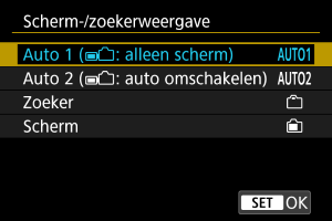 - U kunt ook schakelen tussen de zoekerweergave en de schermweergave door op een knop te drukken die u hebt aangepast en toegewezen aan overschakelen. Met deze instelling ingesteld op [AUTO1] of [AUTO2], reageert de camera dienovereenkomstig op de zoekersensor.