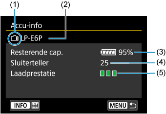 - (4) Het aantal opnamen dat is gemaakt met de huidige accu. Deze waarde wordt opnieuw ingesteld wanneer de accu wordt opgeladen.