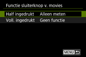 U kunt de functies instellen die tijdens het opnemen van video's worden uitgevoerd wanneer u de ontspanknop half of volledig indrukt.