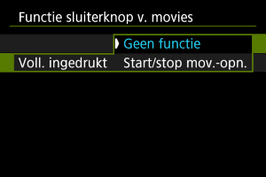 Wanneer [Voll. ingedrukt] is ingesteld op [Start/stop mov.-opn.], kunt u de video-opname niet alleen starten en stoppen met de video-opnameknop, maar ook door de ontspanknop volledig in te drukken, of door gebruik van een draadloze afstandsbediening (afzonderlijk verkrijgbaar).