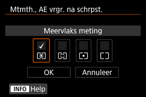 Voor elke meetmethode kunt u instellen of u de belichting wilt vergrendelen (AE-vergrendeling) zodra op onderwerpen is scherpgesteld met 1-beeld AF. De belichting wordt vergrendeld terwijl u de ontspanknop half ingedrukt houdt. Selecteer meetmethoden voor AE-vergrendeling en voeg een vinkje toe []. Selecteer [OK] om de instelling vast te leggen.