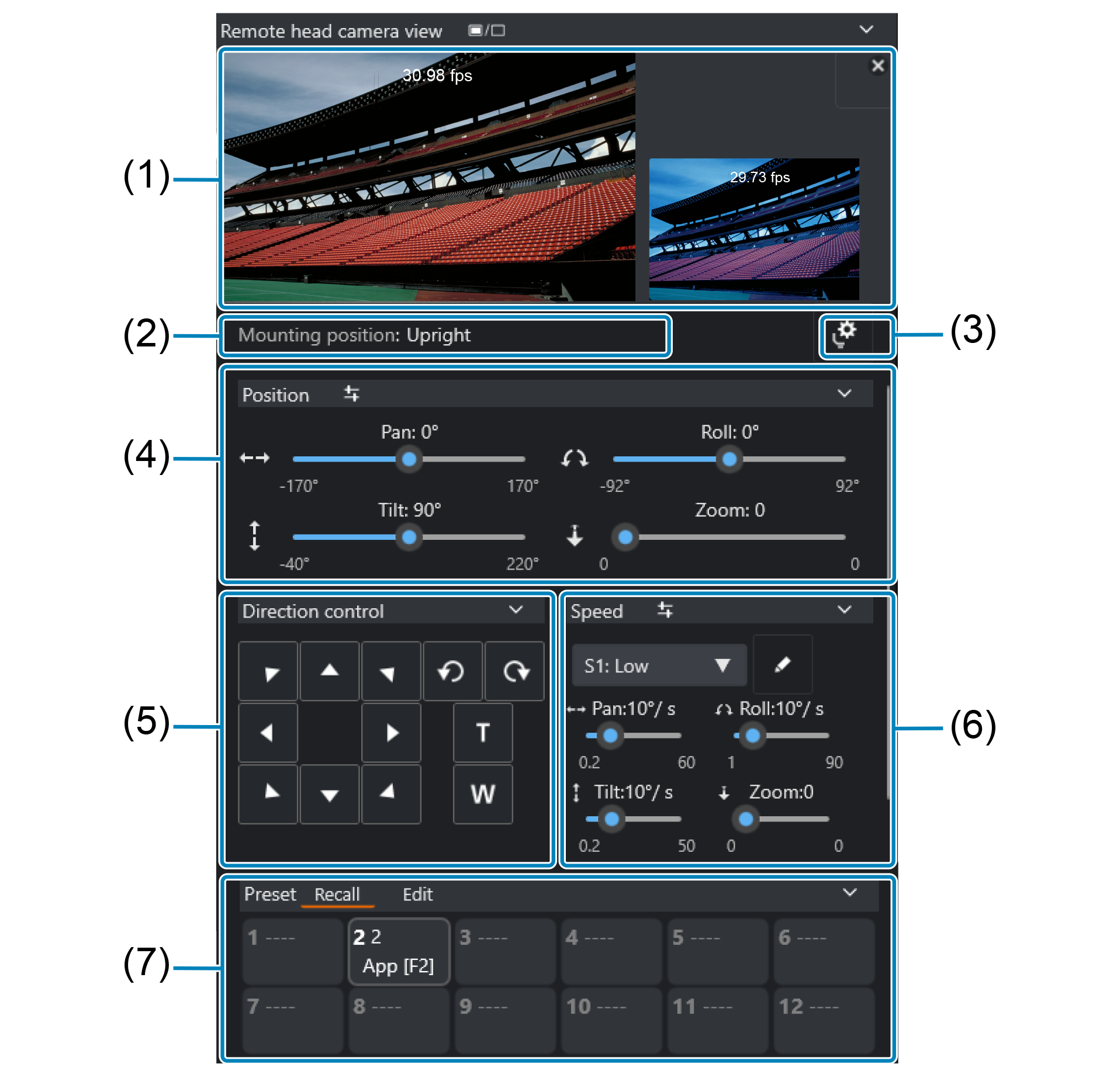 - (7) Tap [Edit] to record the current position of the remote head. Tap preset buttons [1] through [12] to record the position on the displayed [Preset] screen. Tap [Recall] followed by the button where the preset is recorded to move the remote head to the recorded position.