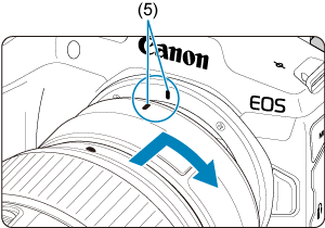 - Wyrównaj czerwone wskaźniki mocowania (5) na adapterze i aparacie, a następnie obróć obiektyw w kierunku wskazanym strzałką, aż do jego zablokowania.