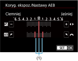 • Obróć pokrętło Pokrętło główne, aby ustawić zakres sekwencji naświetlania (1). Wartość korekty ekspozycji ustawia się, obracając pokrętło Pokrętło szybkiej kontroli.