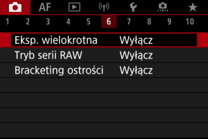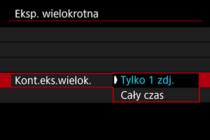 - W przypadku opcji [Cały czas] fotografowanie z ekspozycją wielokrotną będzie działało do czasu zmiany ustawienia z punktu 2 na [Wyłącz].