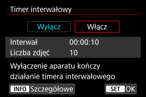 - Aby zatrzymać fotografowanie z samowyzwalaczem interwałowym, wybierz [Wyłącz] albo ustaw przełącznik zasilania w pozycji