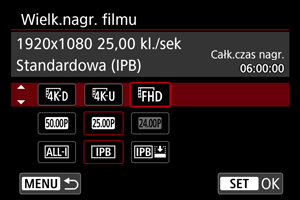 Rozmiar nagrania, prędkość nagrywania i metodę kompresji można ustawić wybierając [: Wielk.nagr. filmu].