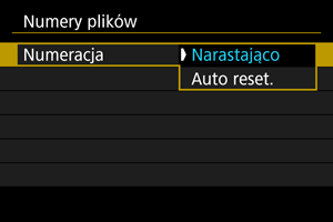 Zarejestrowane obrazy zapisane w folderze mają przypisany numer pliku od 0001 do 9999. Można zmienić sposób numerowania plików obrazów.