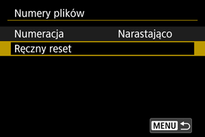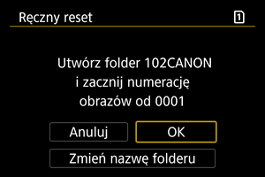 Po ręcznym resetowaniu numerów plików automatycznie jest tworzony nowy folder, a numery plików obrazów zapisywanych w tym folderze rozpoczynają się od 0001.