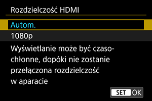 Ustaw rozdzielczość wyjściową obrazu używaną, gdy aparat jest podłączony do telewizora lub zewnętrznego urządzenia nagrywającego za pomocą kabla HDMI.